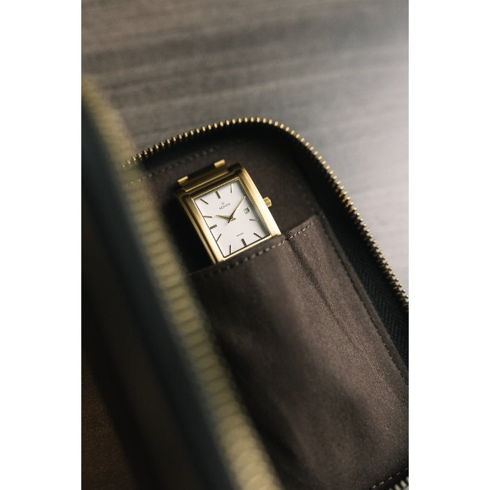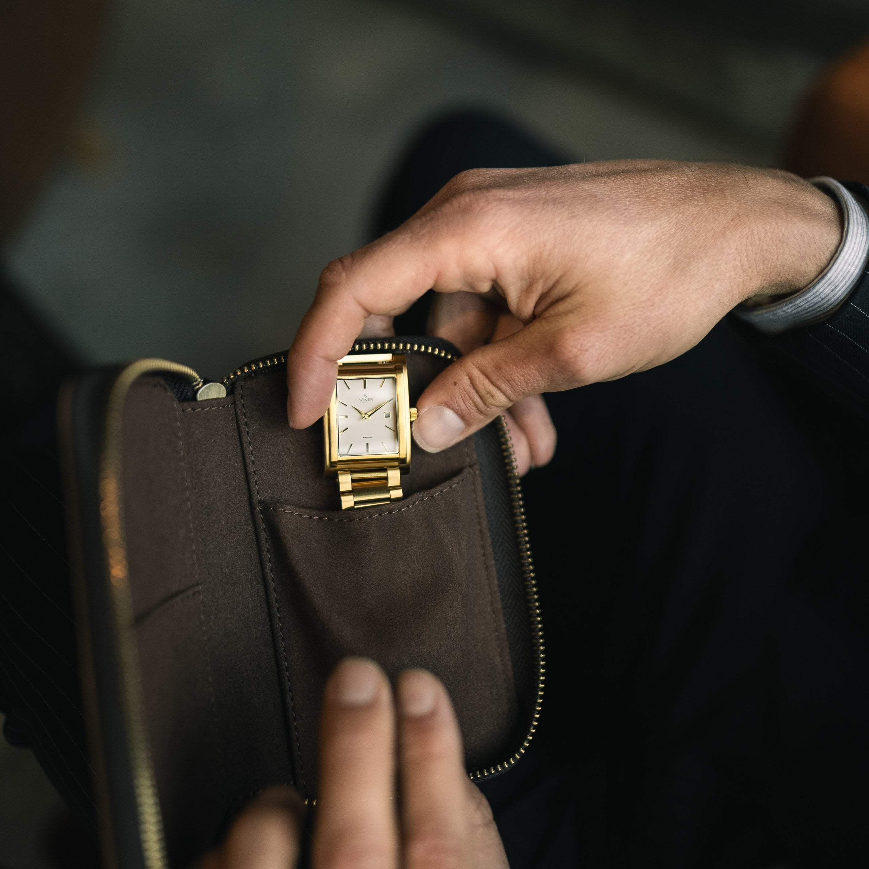 Choose a single-slot leather case. Secure the watch on its pillow, tuck strap tails flat, and close the zipper smoothly. Pick black for sleek minimalism or brown for warm character.