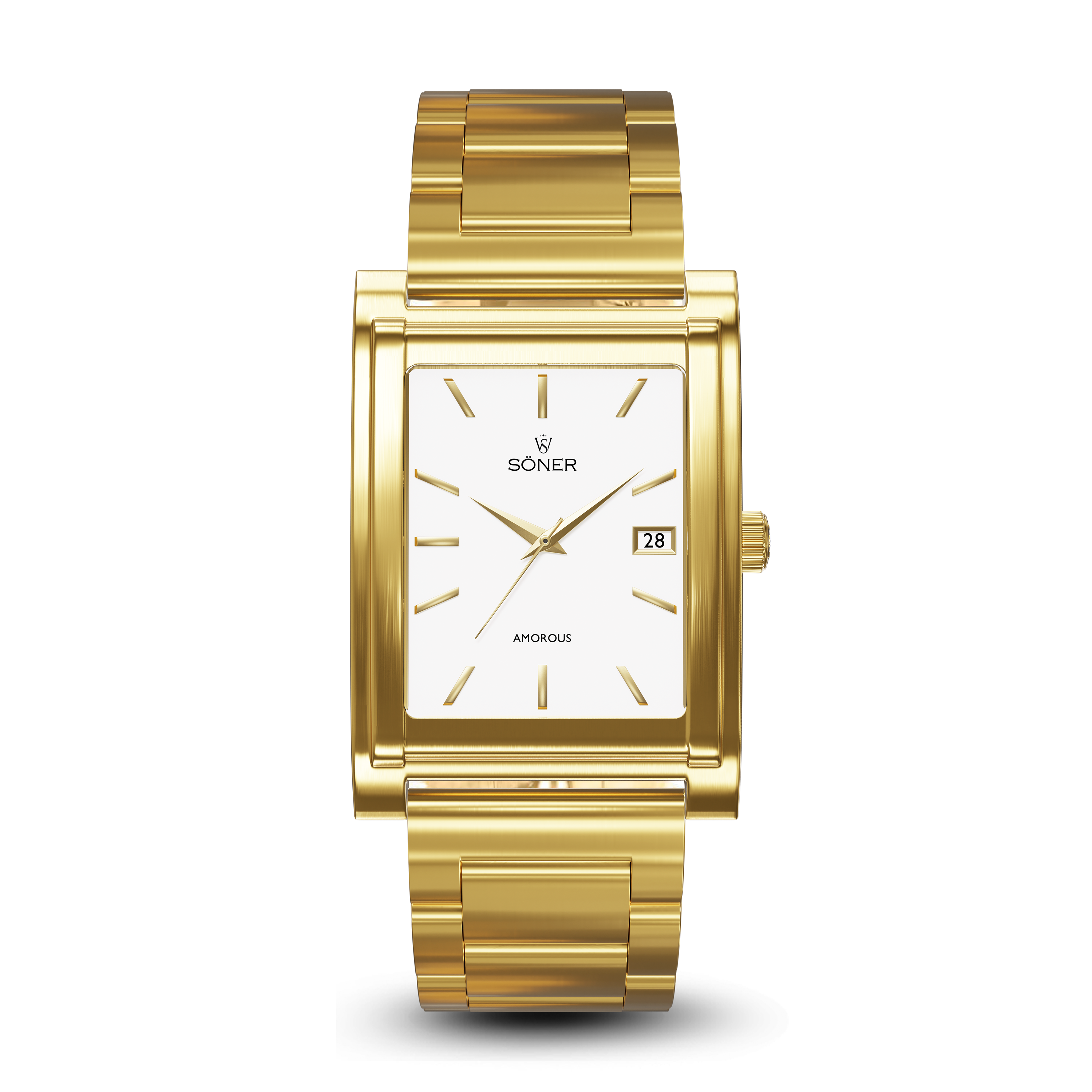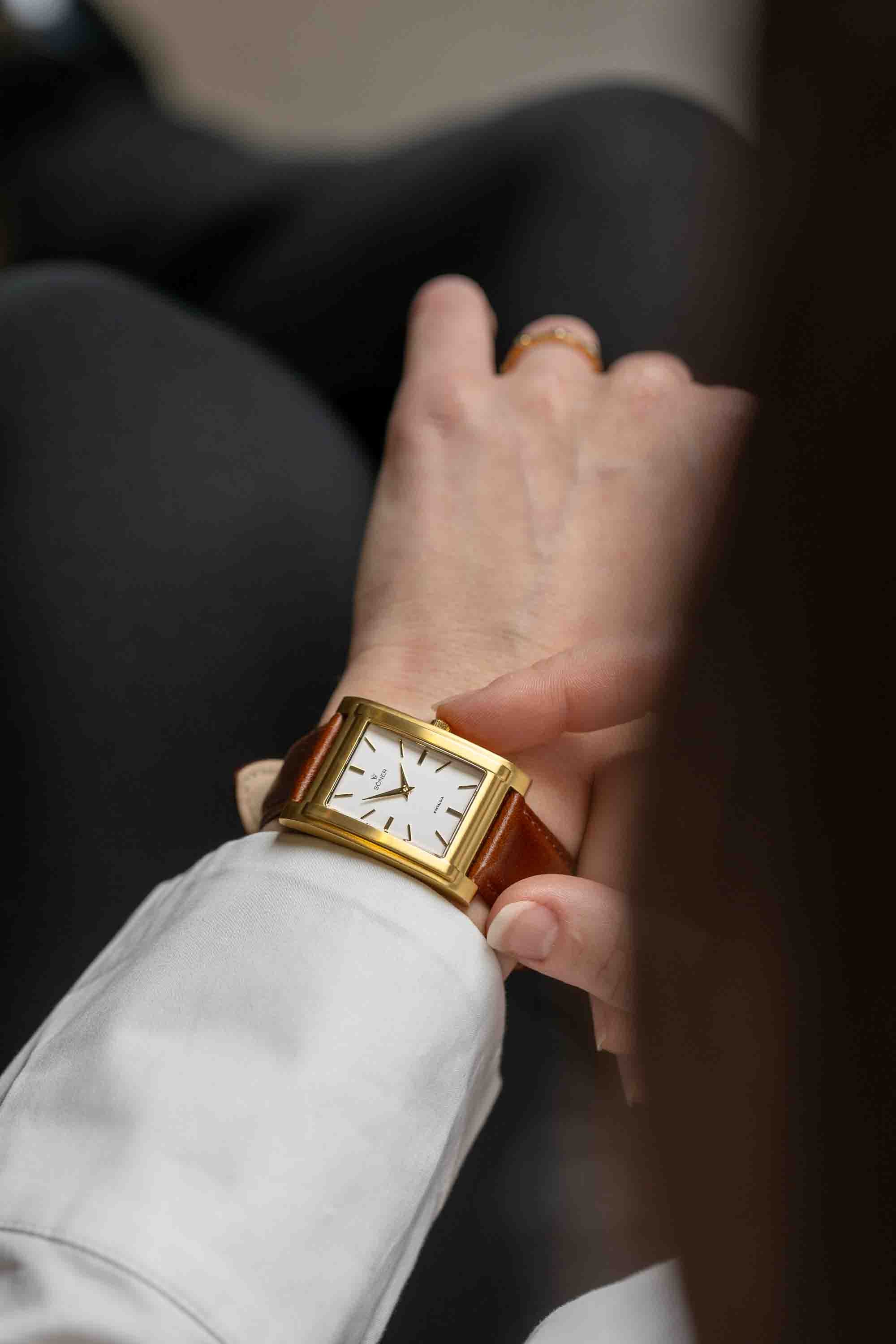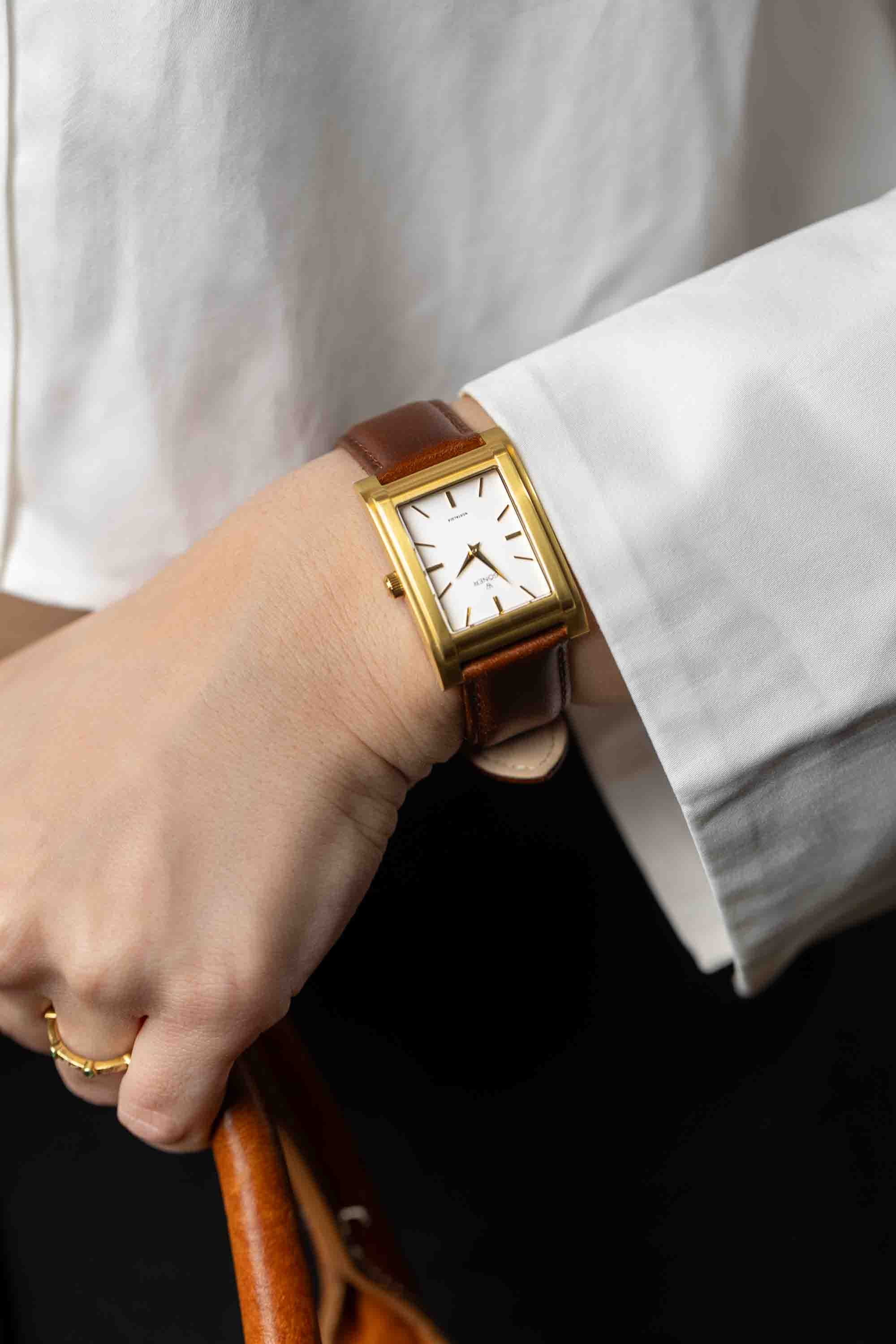 The Nostalgia Chicago by Söner Watches stands as a refined interpretation of the rectangular gold watch, echoing the enduring spirit of Art Deco. Its brushed gold-plated case, crafted from extra-hardened surgical steel, frames a pristine white dial where gold-plated indices and hands create a harmonious interplay of light and form. The arched, screw-down case back and custom crown reflect a meticulous approach to detail, while the clean lines and geometric proportions evoke a quiet confidence suited to both modern and vintage sensibilities.