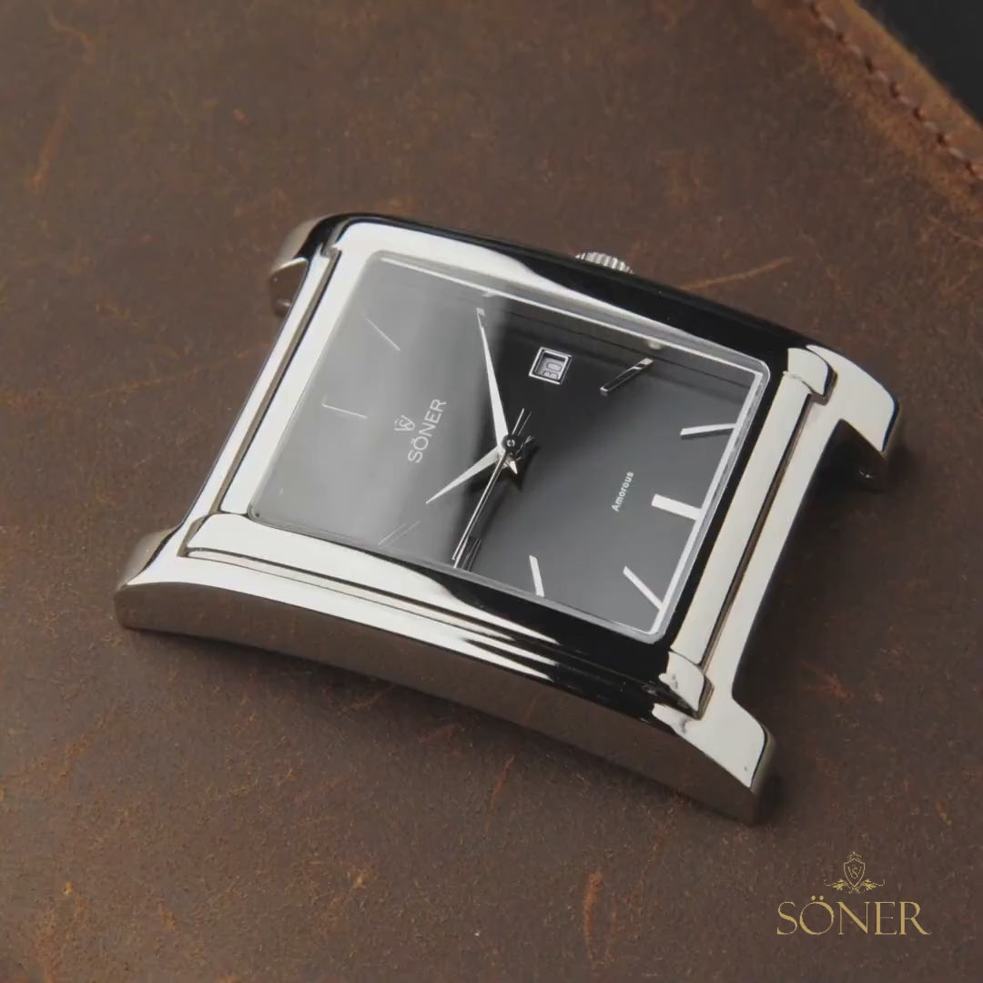 The Amorous Barcelona by Söner Watches stands as a study in geometric clarity and enduring craftsmanship. Its rectangular automatic case, polished to a mirror sheen, frames a deep black onyx dial where minimalist indices and slender hands glide with quiet assurance. The design draws from Art Deco heritage, yet feels resolutely modern, offering a refined alternative to the conventional round wrist watch.