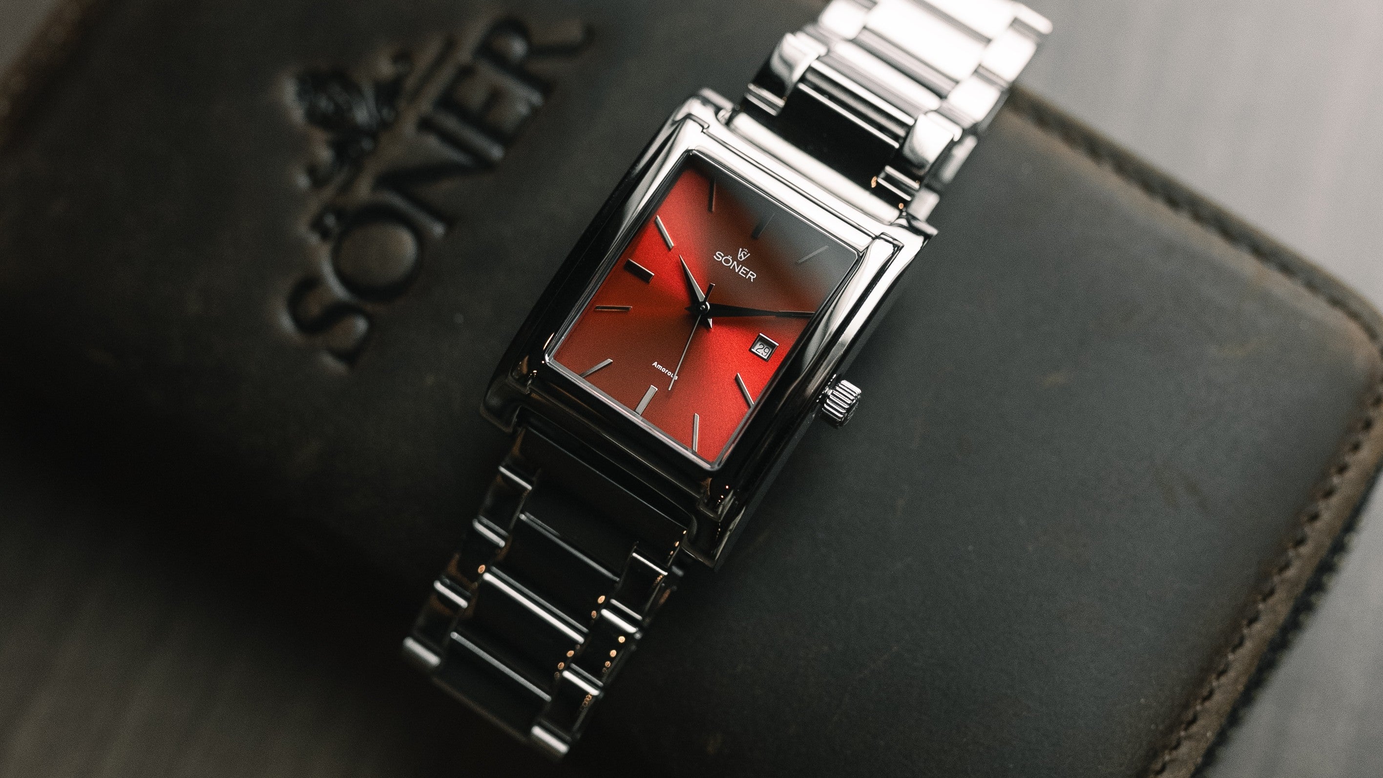 A rectangular automatic watch, featuring a Swiss self-winding movement beating at 28,000 vibrations per hour, with a power reserve of up to 42 hours.