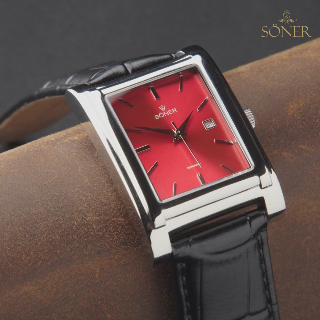 Choose from a genuine leather strap or a stainless steel bracelet to suit your personal style, both designed for a secure and comfortable fit. The polished finish and smooth, sweeping second hand make this rectangular watch with Swiss movement ideal for collectors and anyone seeking a unique timepiece with a luxury feel. Its distinctive red dial and refined case design set it apart from conventional watches, offering a fresh take on classic sophistication.