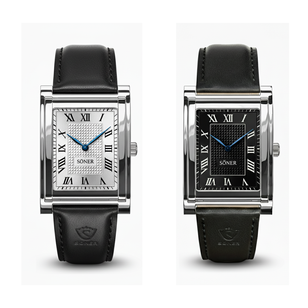 The silver white dial offers clarity and balance with an architectural feel, while the black dial delivers depth and quiet confidence. Both feature clean rectangular lines, Roman numerals, and a refined hobnail guilloché center that adds subtle texture to the dial.